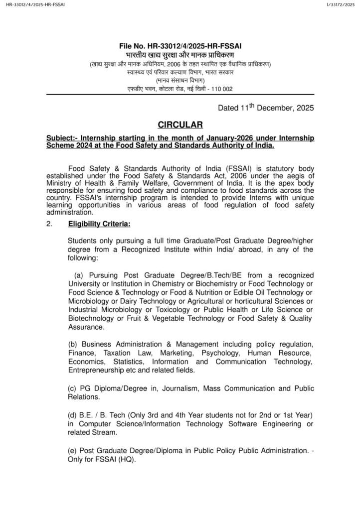 Subject:- Internship starting in the month of Jan- 2026 under Internship Scheme 2026 at Food Safety and Standards Authority of India