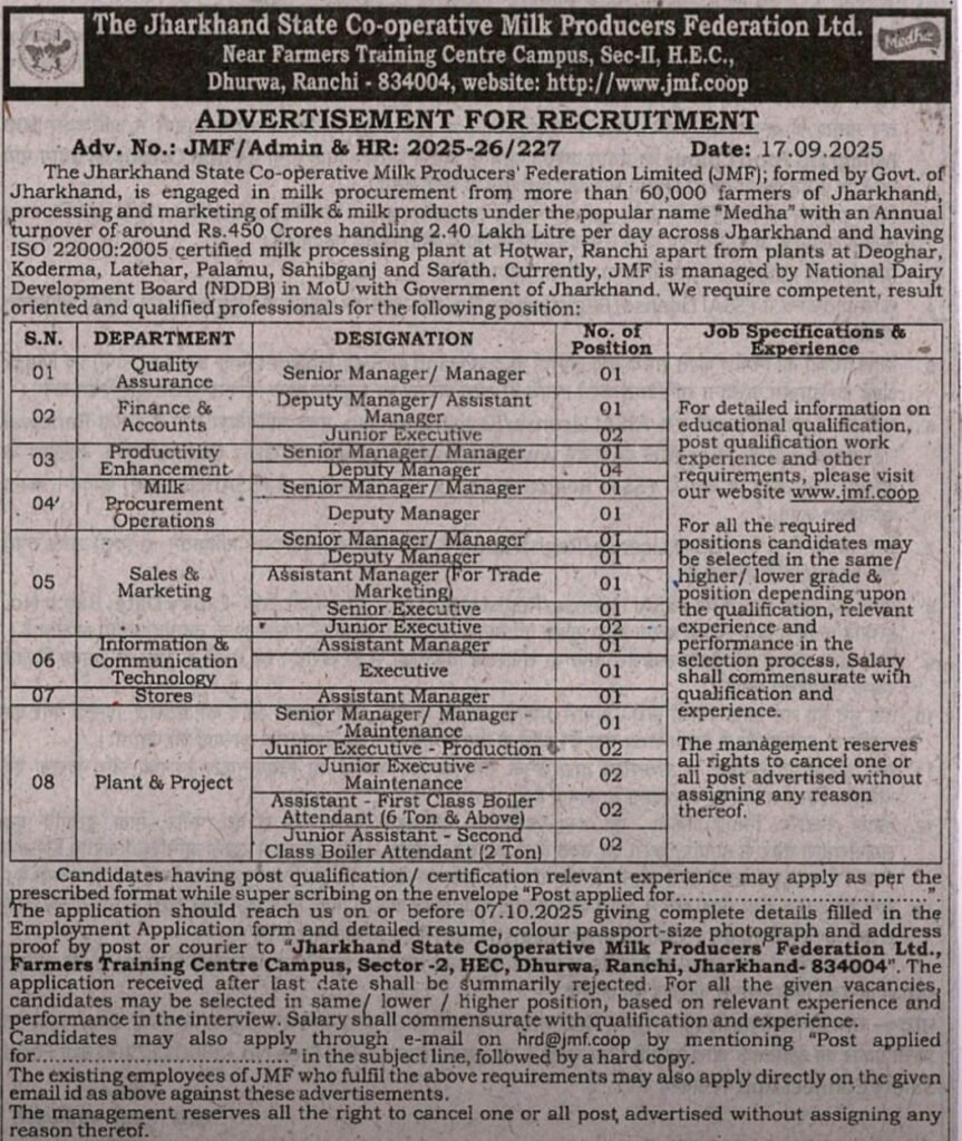 Candidates, having post qualification/ certification relevant experience may apply as per the prescribed format while super scribing on the envelope “Post applied for The application should reach us on or before 07.10.2025 giving complete details filled in the Employment Application form and detailed resume, colour passport-size photograph and address proof by courier to “Jharkhand State Coonerative Milk Producers Federation Ltd., g Centre Campus, Sector 2, BEC, bhurwa, Ranchi, Jharkhand- 834004”.