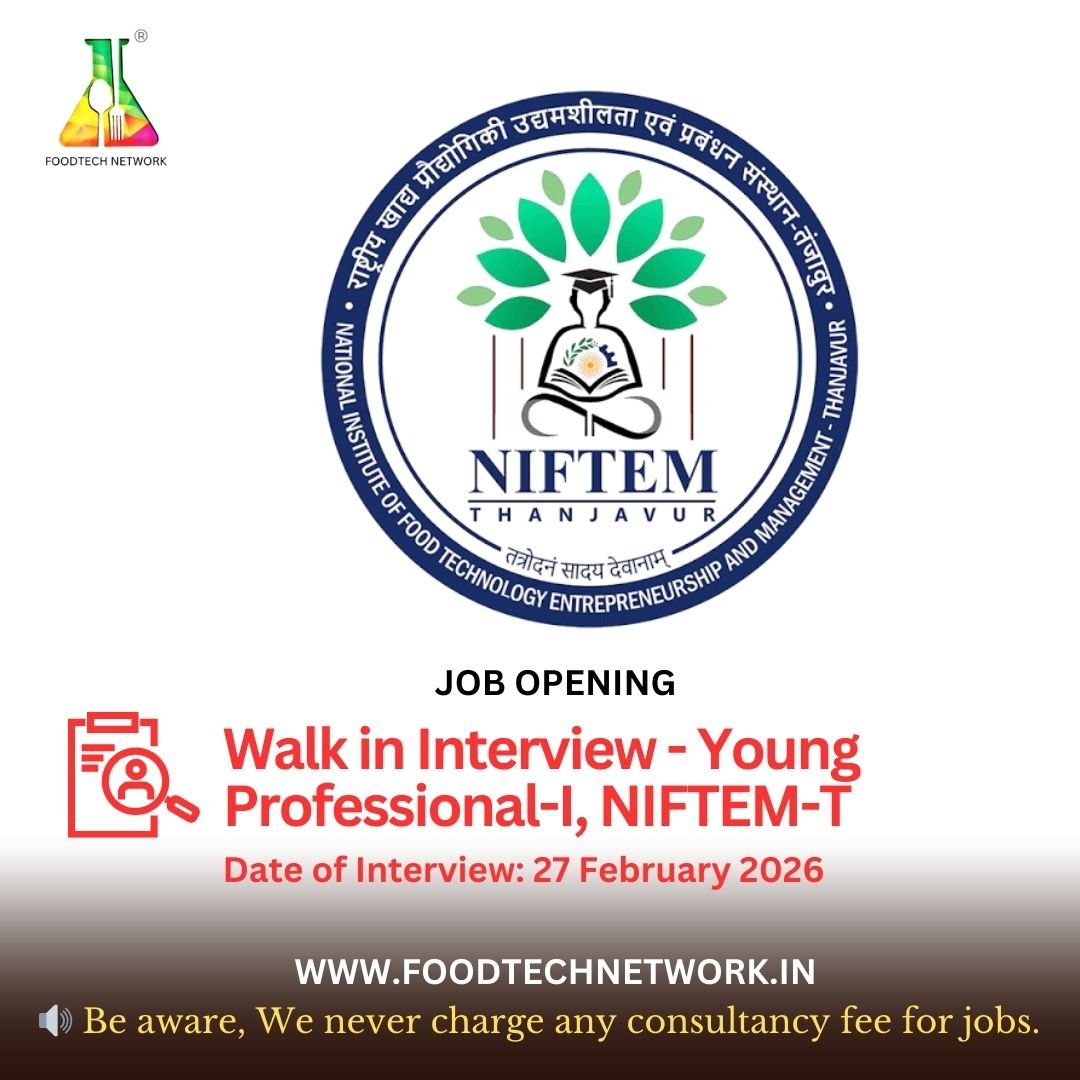 The National Institute of Food Technology, Entrepreneurship and Management, Thanjavur (NIFTEM-T), an Institute of National Importance under the Ministry of Food Processing Industries, Government of India, has announced a Walk-in Interview for the recruitment of Young Professional-I (YP-I) on a contract basis.